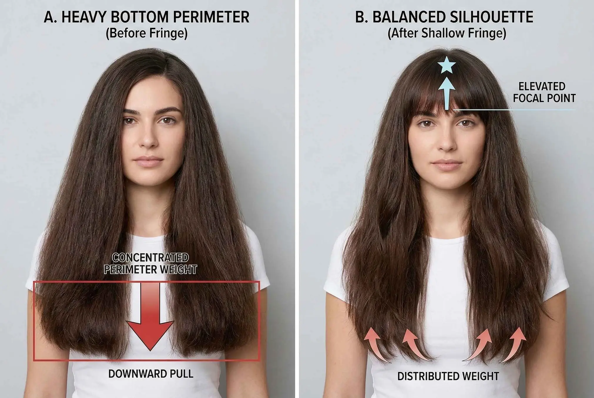By incorporating bangs, you isolate a specific percentage of the hair’s overall density—usually from the apex (top of the head) forward to the front hairline. You are structurally removing this hair from the bottom perimeter. The result is an immediate reduction in lower bulk and a redistribution of volume toward the upper half of the head.