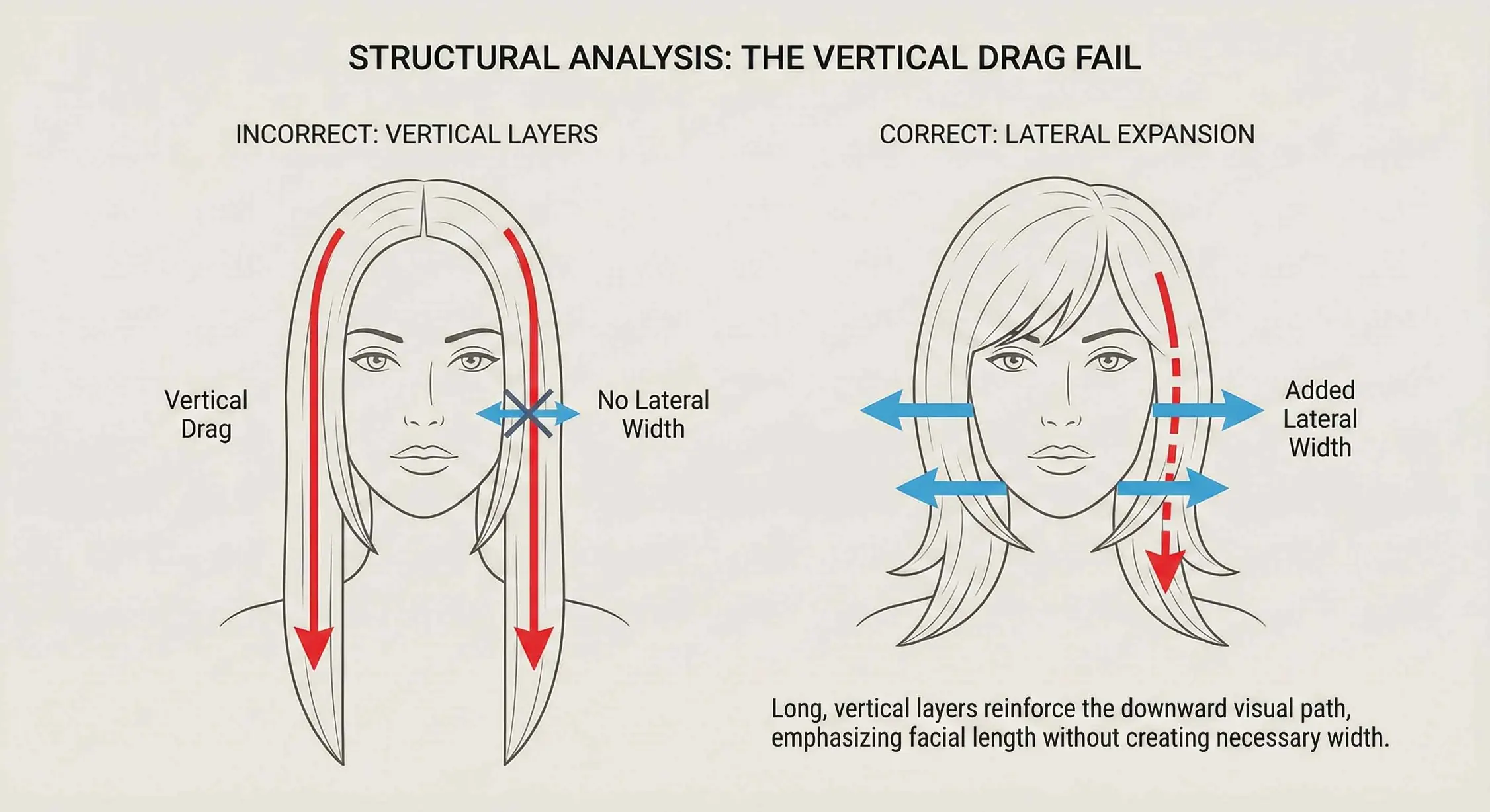 When hair is cut into long, flat, face-framing pieces that fall vertically past the cheekbones, it creates a vertical drag. This structural choice essentially frames the face with two parallel, descending lines. By drawing the eye straight down the cheeks without any lateral interruption, the face appears even longer and narrower.