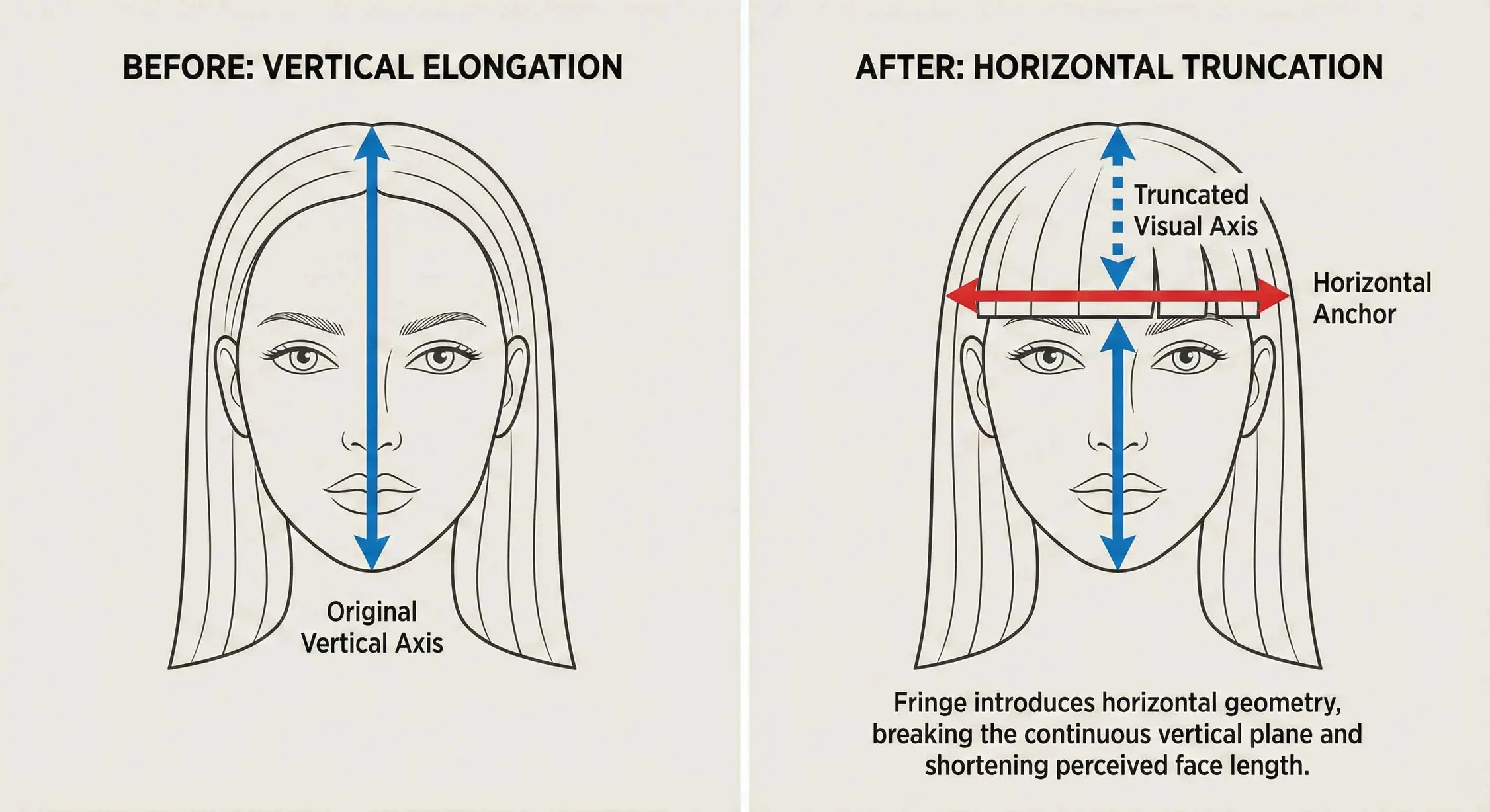 Bangs do not inherently shorten a face. What they do is truncate the continuous vertical plane and manipulate the viewer’s focal point. This mechanism relies on how bangs change face proportions by establishing new horizontal or diagonal axes.