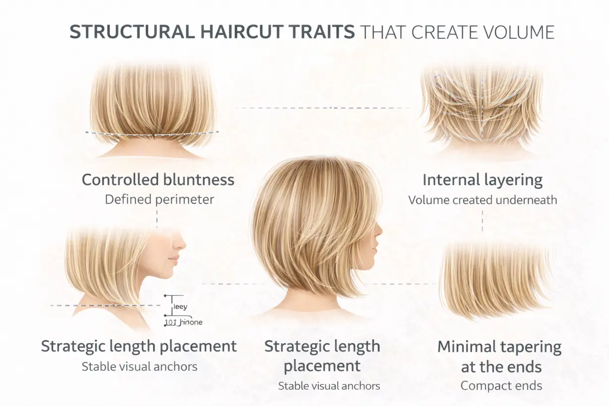 Diagram illustrating structural haircut traits such as controlled bluntness, internal layering, and strategic length placement for thin hair