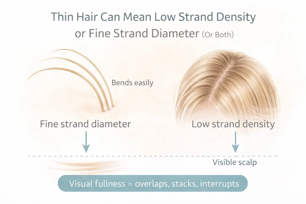 Thin hair can mean low strand density, fine strand diameter, or a combination of both.