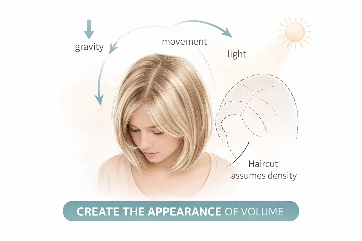 Diagram explaining how haircut structure creates visual volume for thin hair under gravity and light