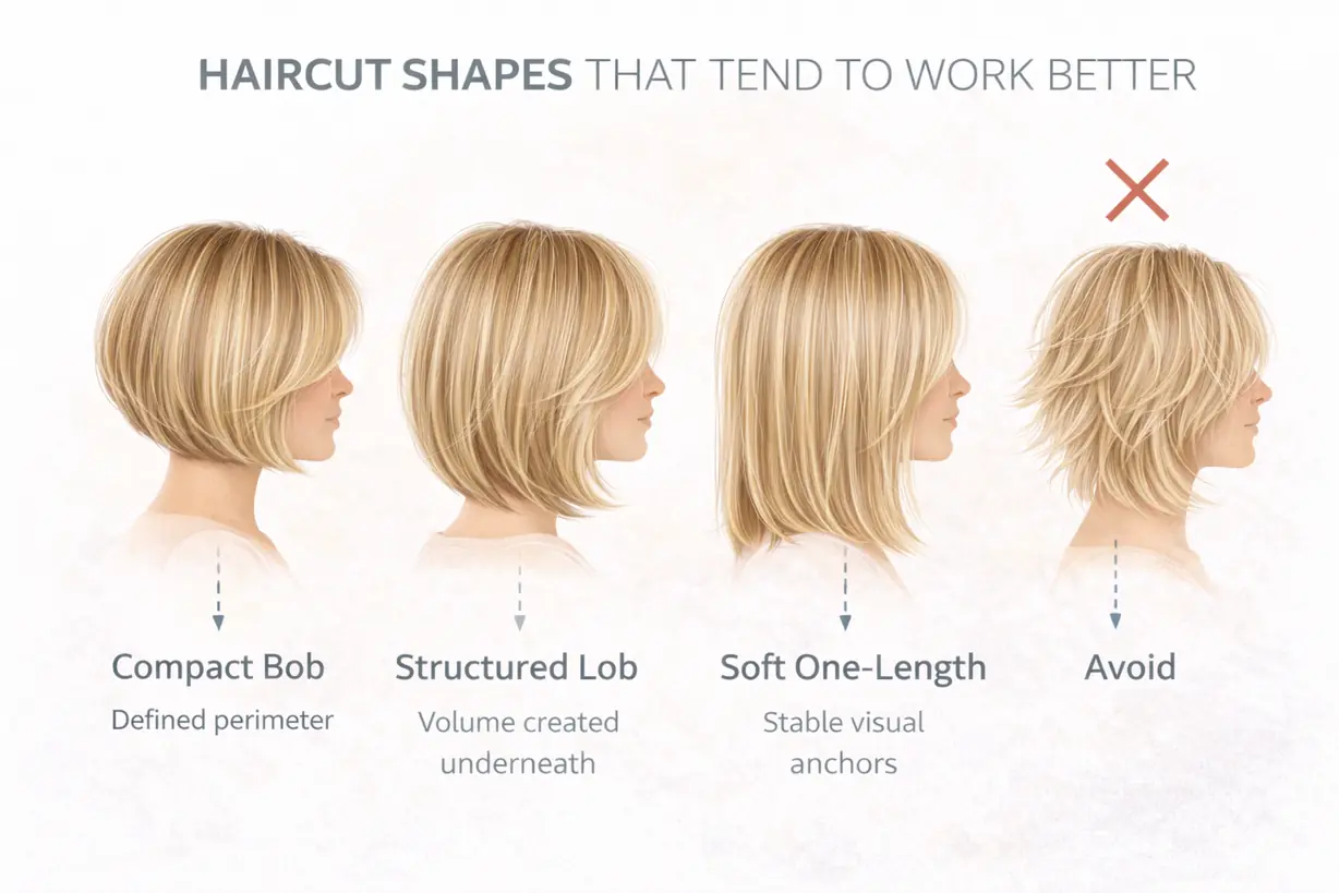 Compact bobs that hold weight at the perimeter often make thin hair look intentional.