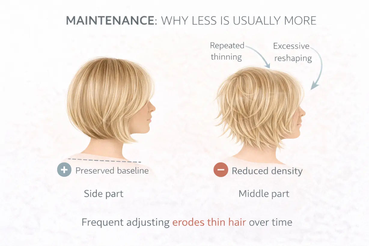 Diagram explaining why less frequent structural adjustments help thin hair retain density and long-term volume