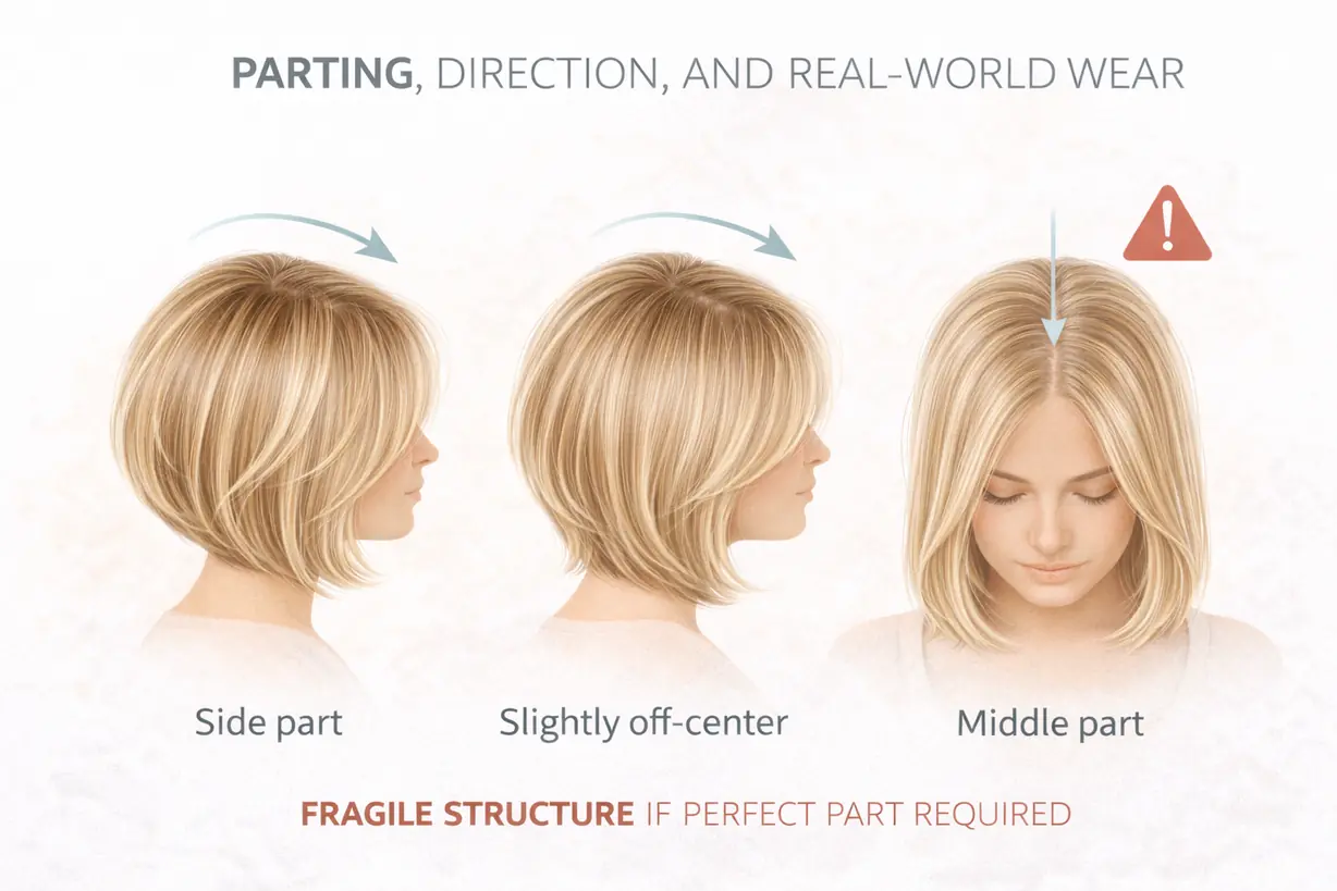 Diagram comparing side, off-center, and middle parts to show how haircut structure affects volume and everyday wear for thin hair