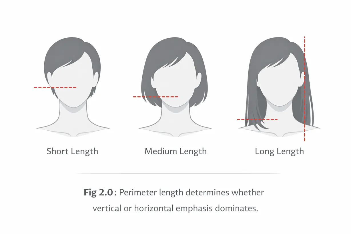 Hair design operates on applied geometry. The perimeter length establishes a visual boundary. That boundary determines where the viewer’s eye stops — this is known as the terminal point of the design line.