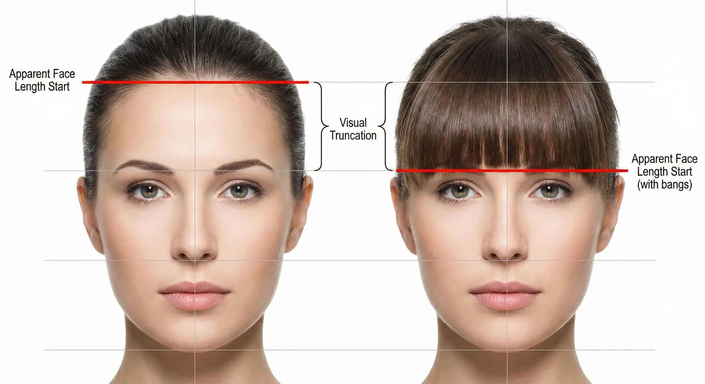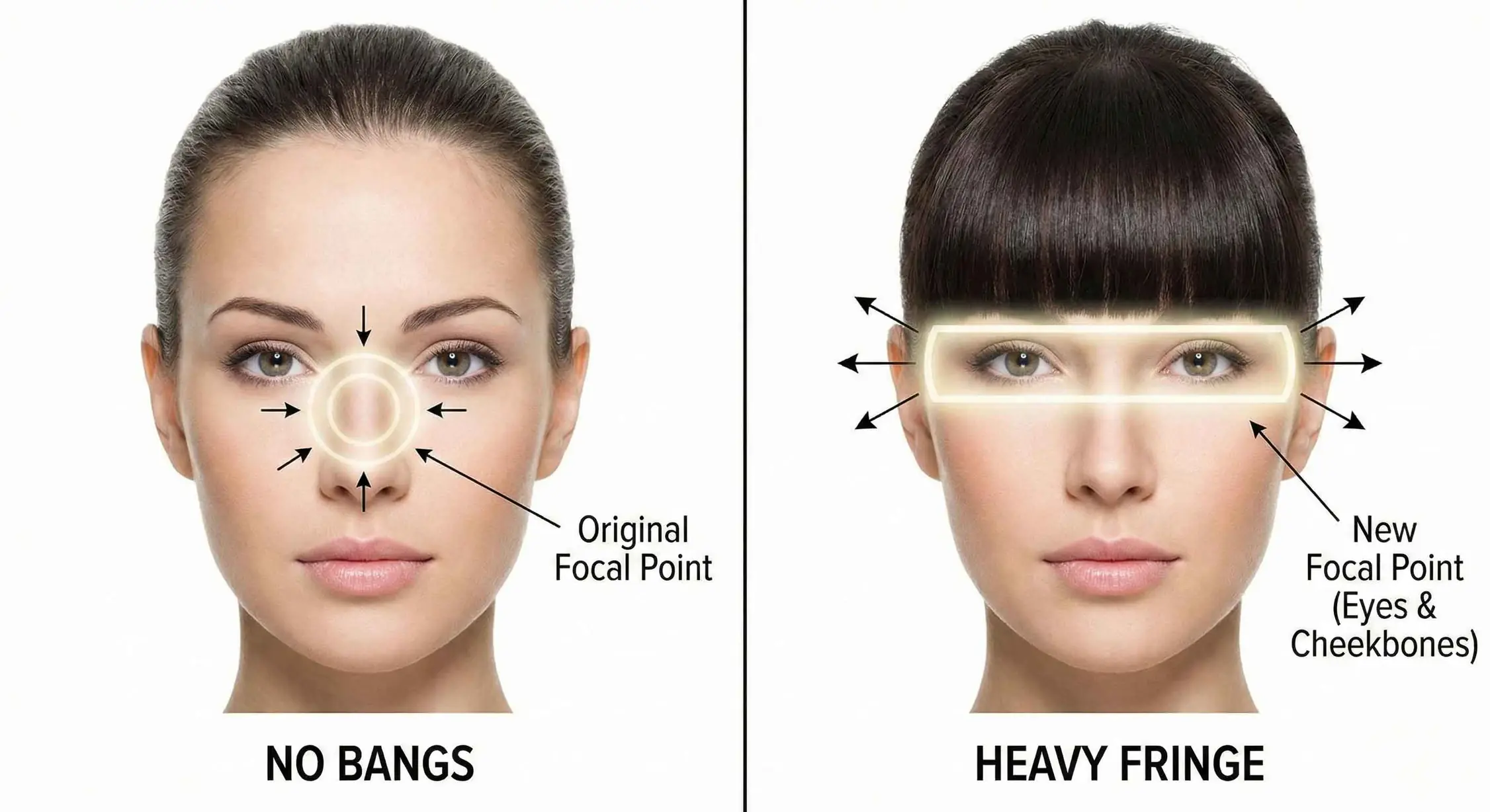 Hair structure dictates where an observer’s eye will rest. Without bangs, the focal point of the face typically lands on the center of the face, near the nose.