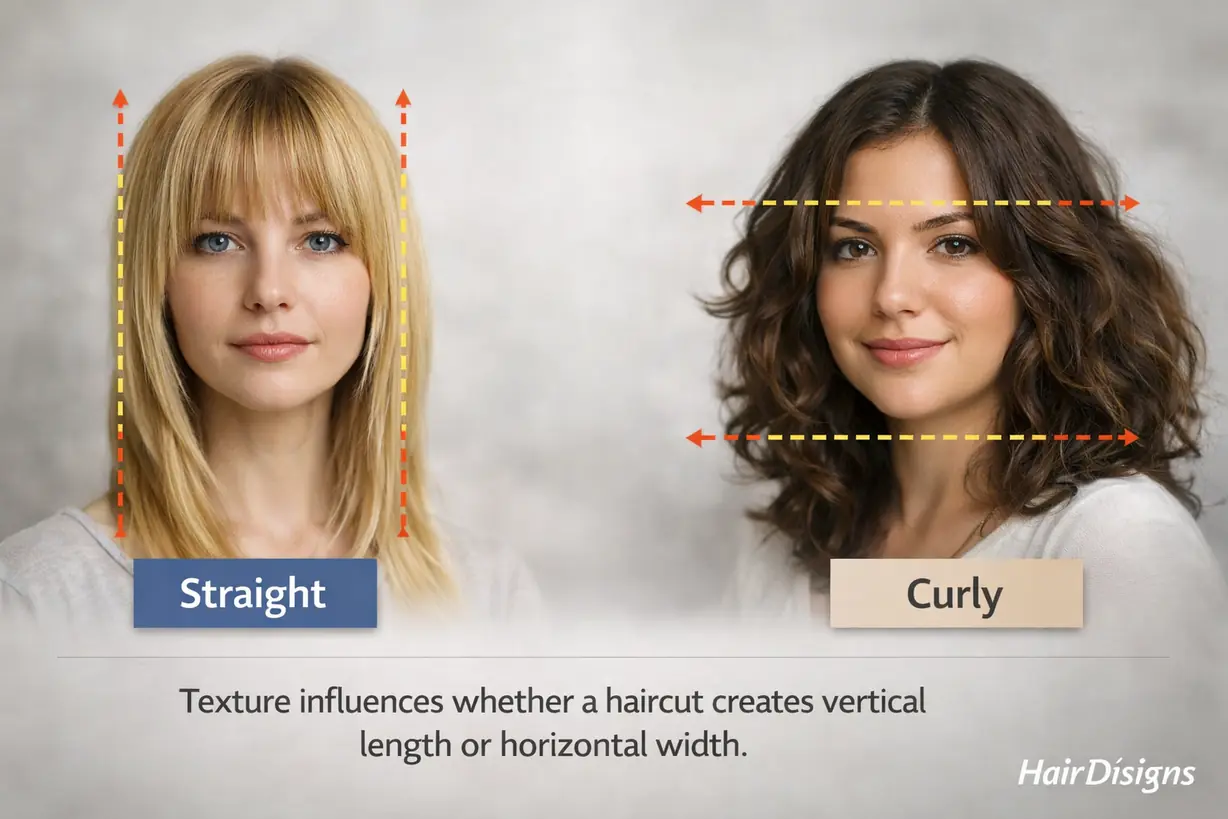 Straight hair tends to fall downward, emphasizing vertical lines. Curly or wavy hair expands outward, creating width.