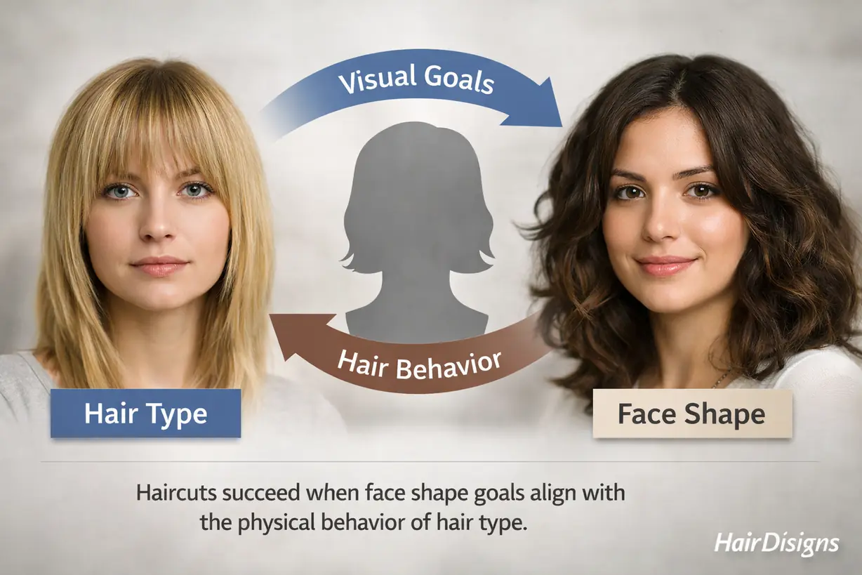 Face shape defines proportion and visual balance. Hair type determines how the structure behaves in reality.