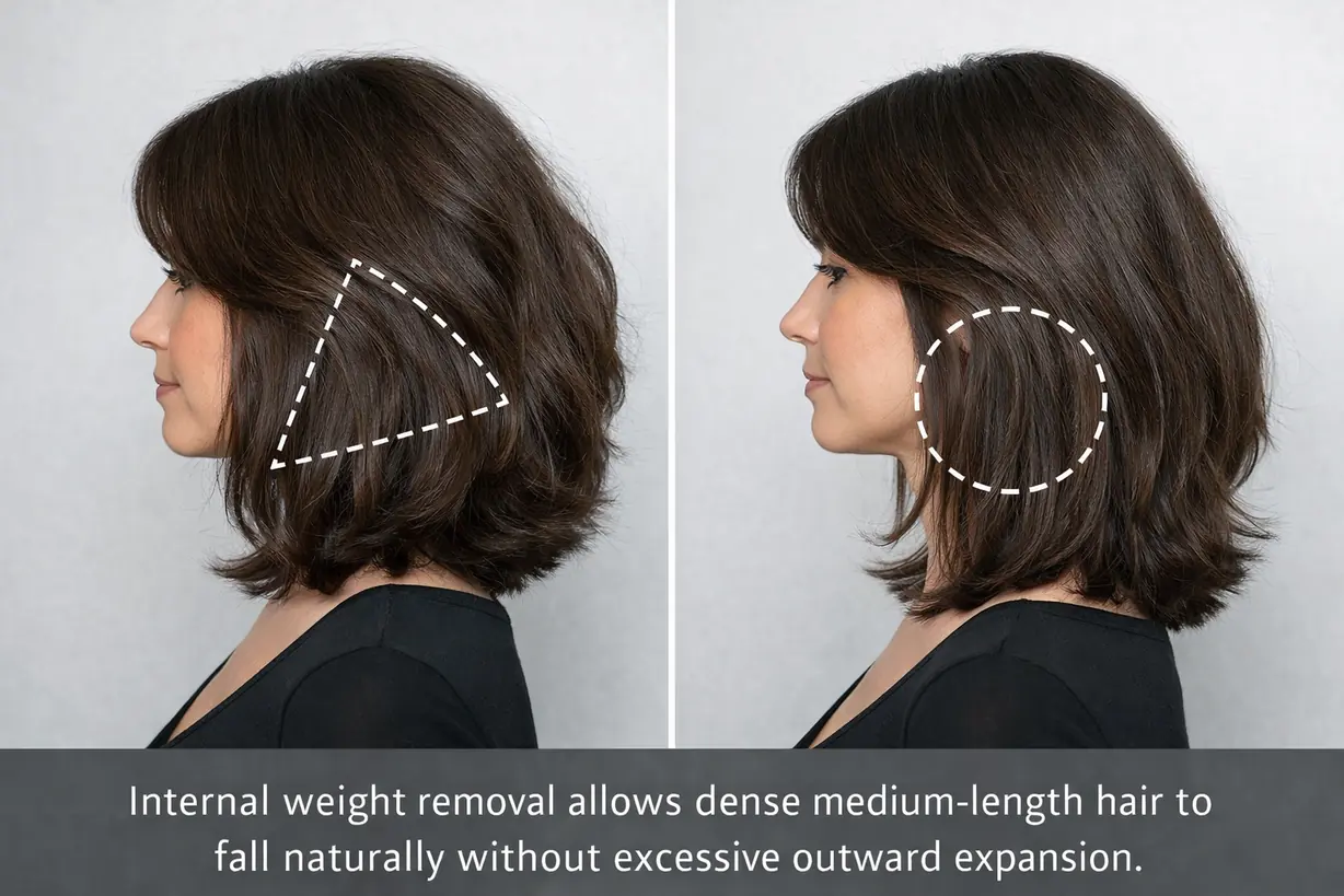 Internal weight removal allows dense medium-length hair to fall naturally without excessive outward expansion.